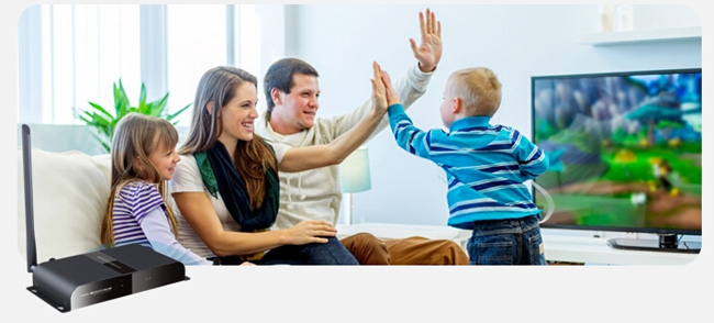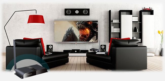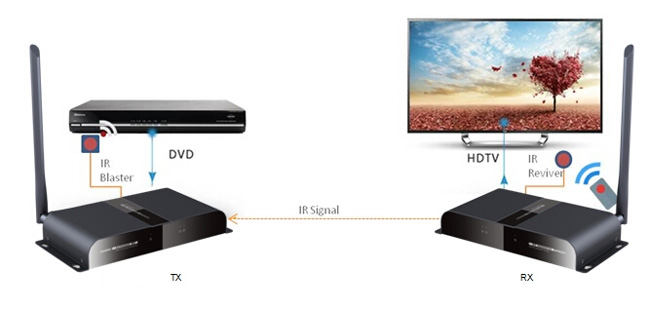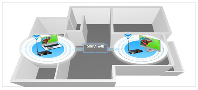 ขยายสัญญาณ HDMI แบบไร้สาย ทั้งภาพและเสียง ได้ไกลสูงสุดถึง 50 เมตร รองรับ 3D และความละเอียด 1080P มีช่องต่อ IR สำหรับรับสัญญาณรีโมทจากปลายทางส่งไปควบคุมเครื่องเล่นต้นทางได้ด้วย