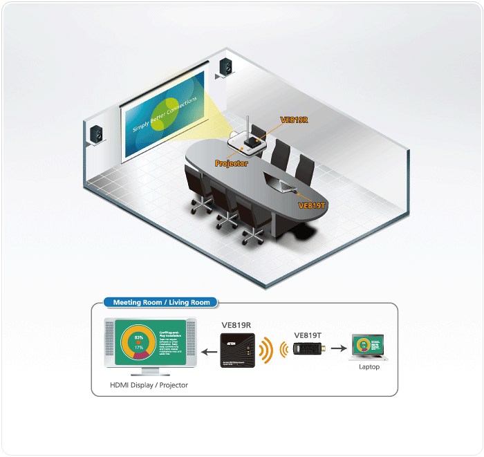The VE819T HDMI Dongle Wireless Transmitter is an ideal choice for meeting rooms and home theater systems. It sends uncompressed Full HD 1080p signal from your HDMI devices such as laptops, computers and set top boxes. Up to four Wireless HDMI Transmitters can be paired to the Receiver, boosting the number of total transmitters per receiver to a maximum of 4.
