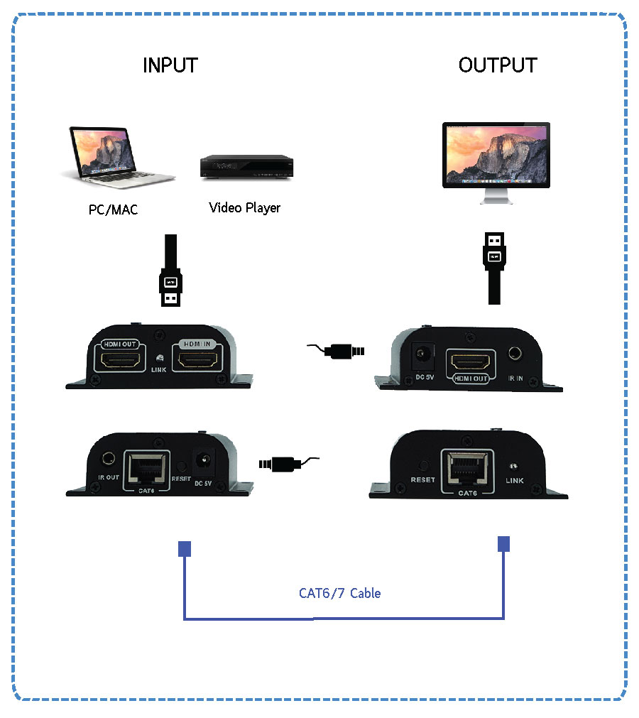 - ขยายสัญญาณ HDMI ผ่านสายเคเบิ้ล CAT6 เส้นเดียวได้ถึง 60 เมตร
