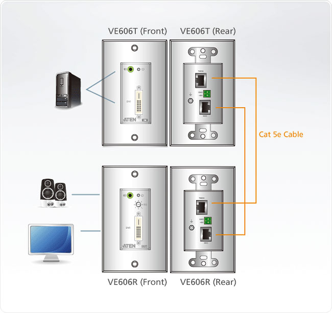The VE606 DVI Over Cat 5 Extender Wall Plate extends DVI and audio signals up to 60m using Cat 5e cable. It supports popular wide screen formats and ensures excellent video quality over long distance transmissions. The VE606 combination can further extend the distance or multiply sources/displays.